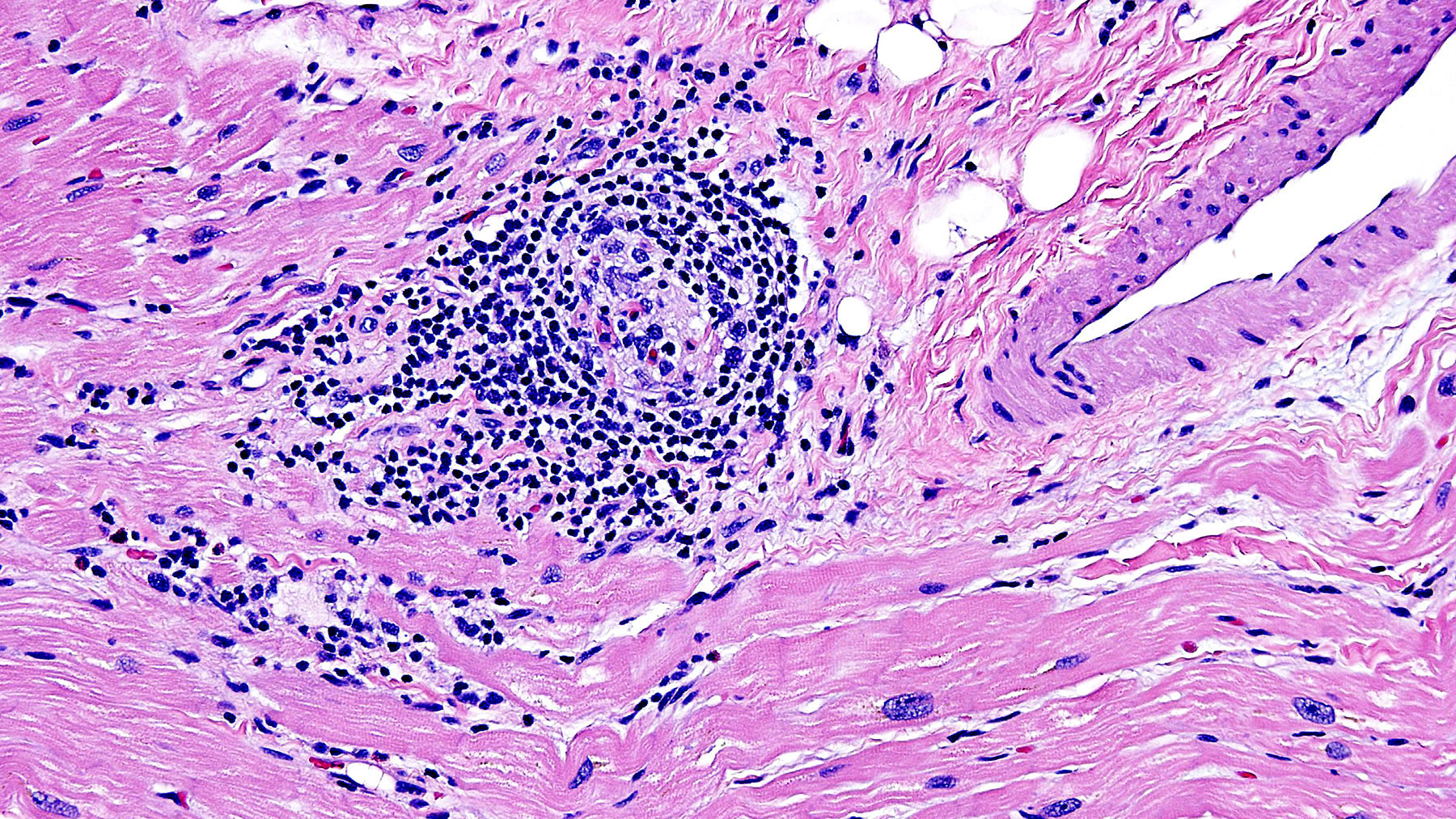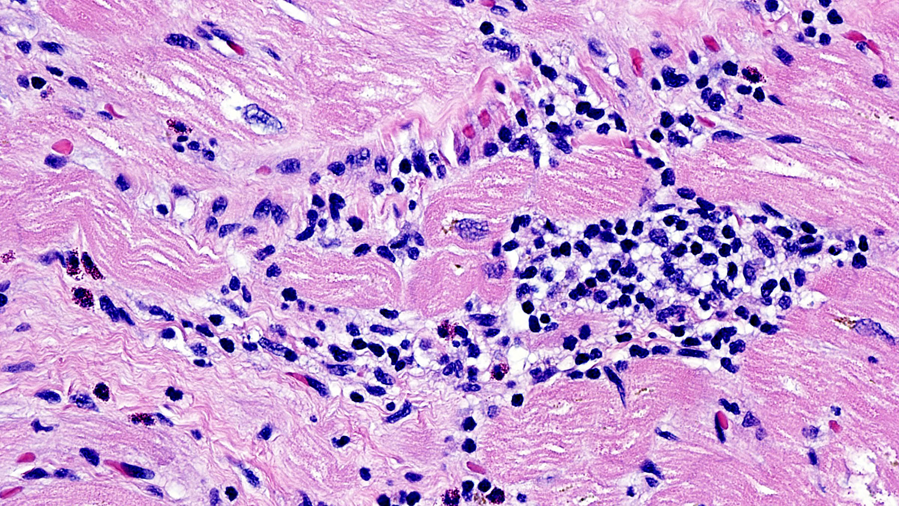 A, B, C, and D) show Chronic interstitial myocarditis with